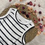 تتميز بنقشة مخططة أفقية باللونين الأبيض والأسود. تصميم عصري وبسيط، مثالي للأيام الدافئة ويمكن تنسيقه مع مختلف القطع السفلية لإطلالات كاجوال أنيقة