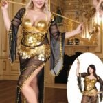 مزين بالترتر والعملات الذهبية، وتنورة طويلة شفافة بفتحة ساق. مناسب لعروض الرقص والمناسبات الخاصة.