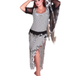 فستان طويل مخطط بالأسود والأبيض، يتميز بفتحة ساق عالية، وتطريزات لامعة أو ترتر على الحواف والحزام.